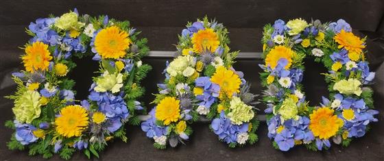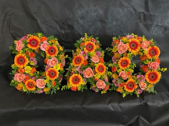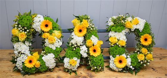 An alternative to based letters, this tribute is designed using a mixture of seasonal flowers in a colour selection of your choosing. We refer to this style as an 'open' design.