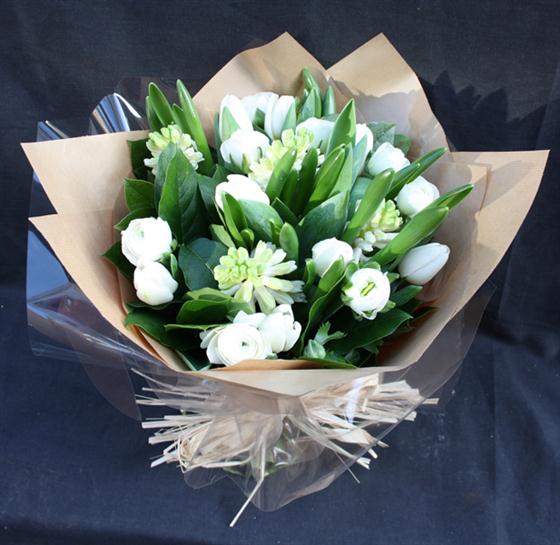 A dreamy mix of white tulips and seasonal white flower with seasonal foliage.