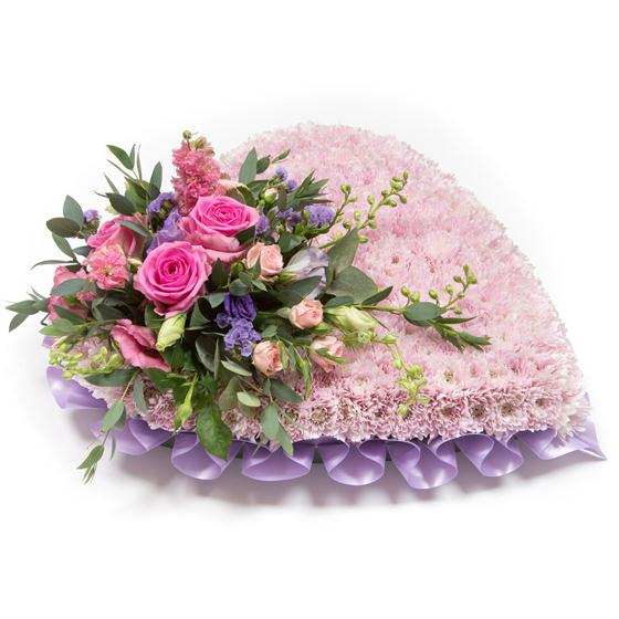 A heart shaped tribute created using a base of pink chrysanthemums with a spray of purples and pinks.