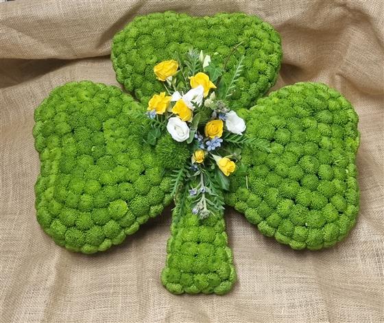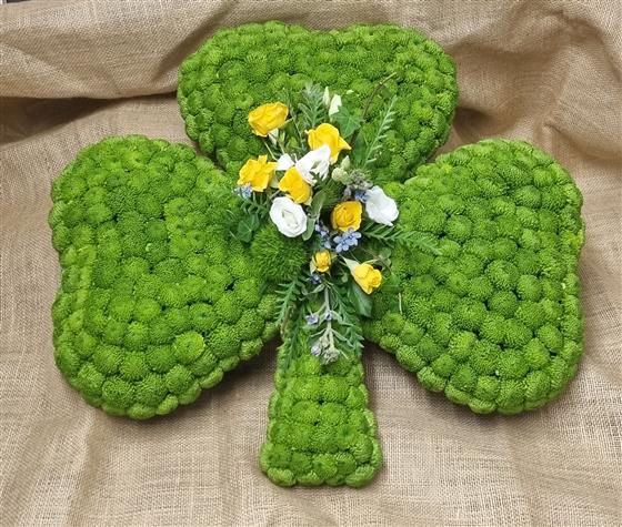 A Beautiful Shamrock Design Uniquely Designed Using Green Chrysanthemums With A Matching Spray On Top.