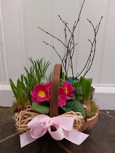 A Beautiful Planted Arrangement that includes various spring bulbs And Other Flowering Plants with Finishing Touches That Makes The Perfect Gift.