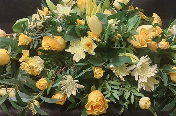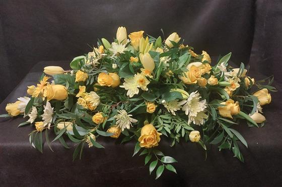 Beautiful casket spray in an assortment of yellow shades of seasonal flowers.