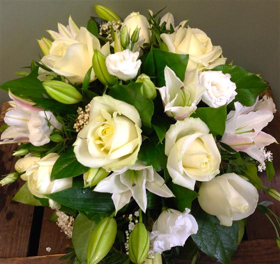 A classic scented bouquet of white oriental lilies, white roses and luscious foliage.